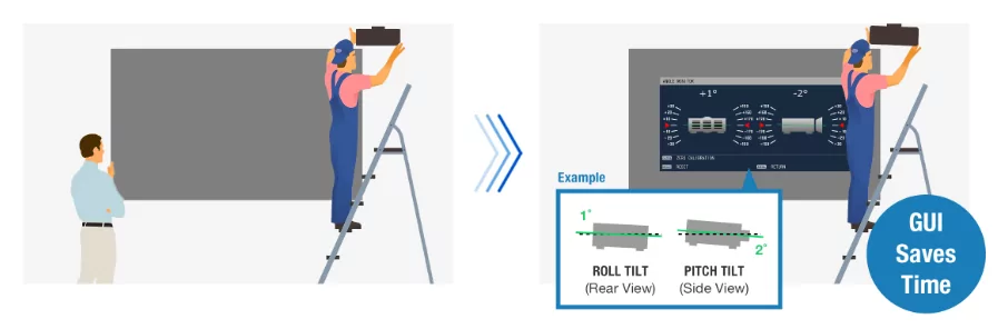 Функция Angle Monitor успешно решает задачу совмещения угла проецирования относительно экрана и коррекции геометрических искажений. Встроенный гироскопический датчик определяет изменения углов наклона и поворота проектора и графически отображает их в экранном меню. Инсталляторы могут регулировать угол проецирования самостоятельно и обходиться собственными силами без помощи второго человека.