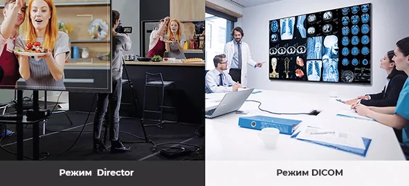 Встроенные профессиональные режимы расширяют возможности применения дисплеев и позволяют использовать для решения специфических задач. Режим Director Mode сводит к минимуму необходимость постобработки, приводя медиаконтент в соответствие с изначальным замыслом создателей. Медицинские специалисты с помощью режима DICOM Simulation Mode могут получать изображения медицинских снимков, например, рентгеновских, в соответствии с требованиями для черно-белых снимков стандарта DICOM.