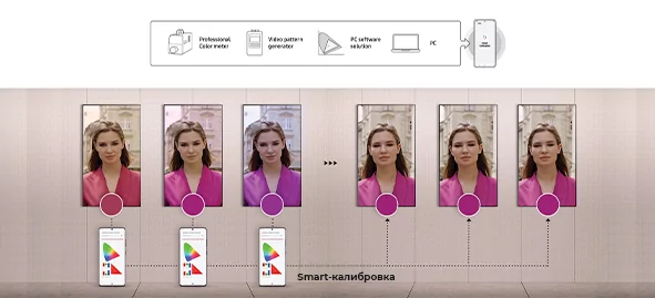При использовании нескольких экранов интеллектуальная калибровка Samsung обеспечивает единообразие фирменного стиля на каждом дисплее в любом месте. С помощью мобильного приложения Samsung функция Smart Calibration обеспечивает точность калибровки, демонстрируя логотипы и другие элементы фирменного стиля в точных цветах.